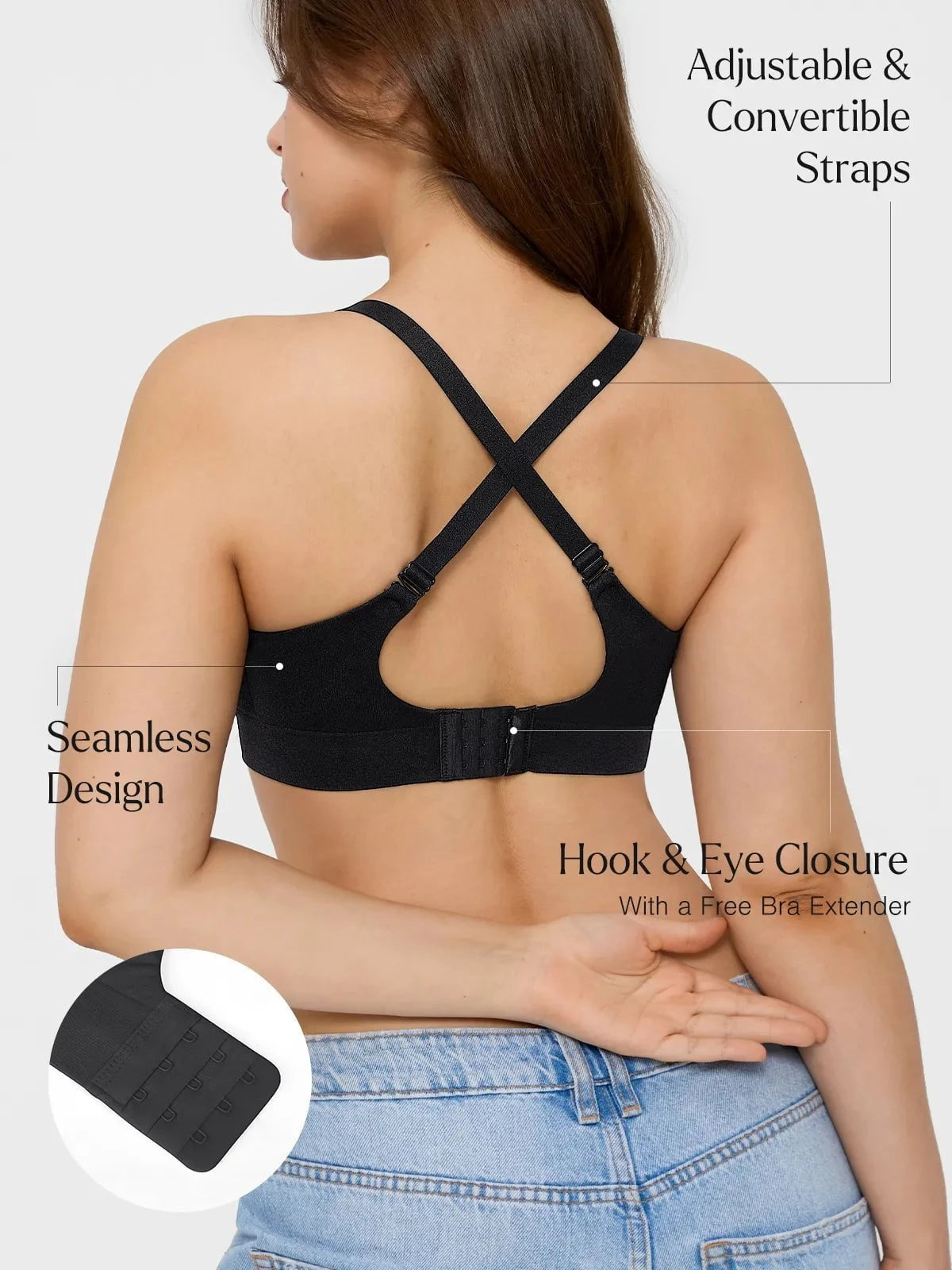 • Convertible Straps & U-Back Design: Adjustable straps easily convert between classic, halter, or crisscross styles to match any outfit. The U-shaped back not only provides extra support but also smooths and minimizes the appearance of back bulges for a clean, sleek silhouette under clothing.