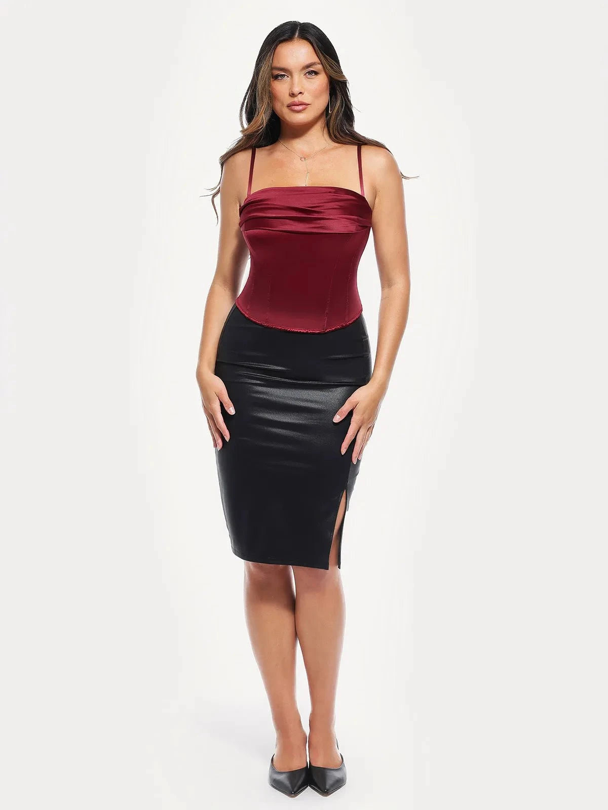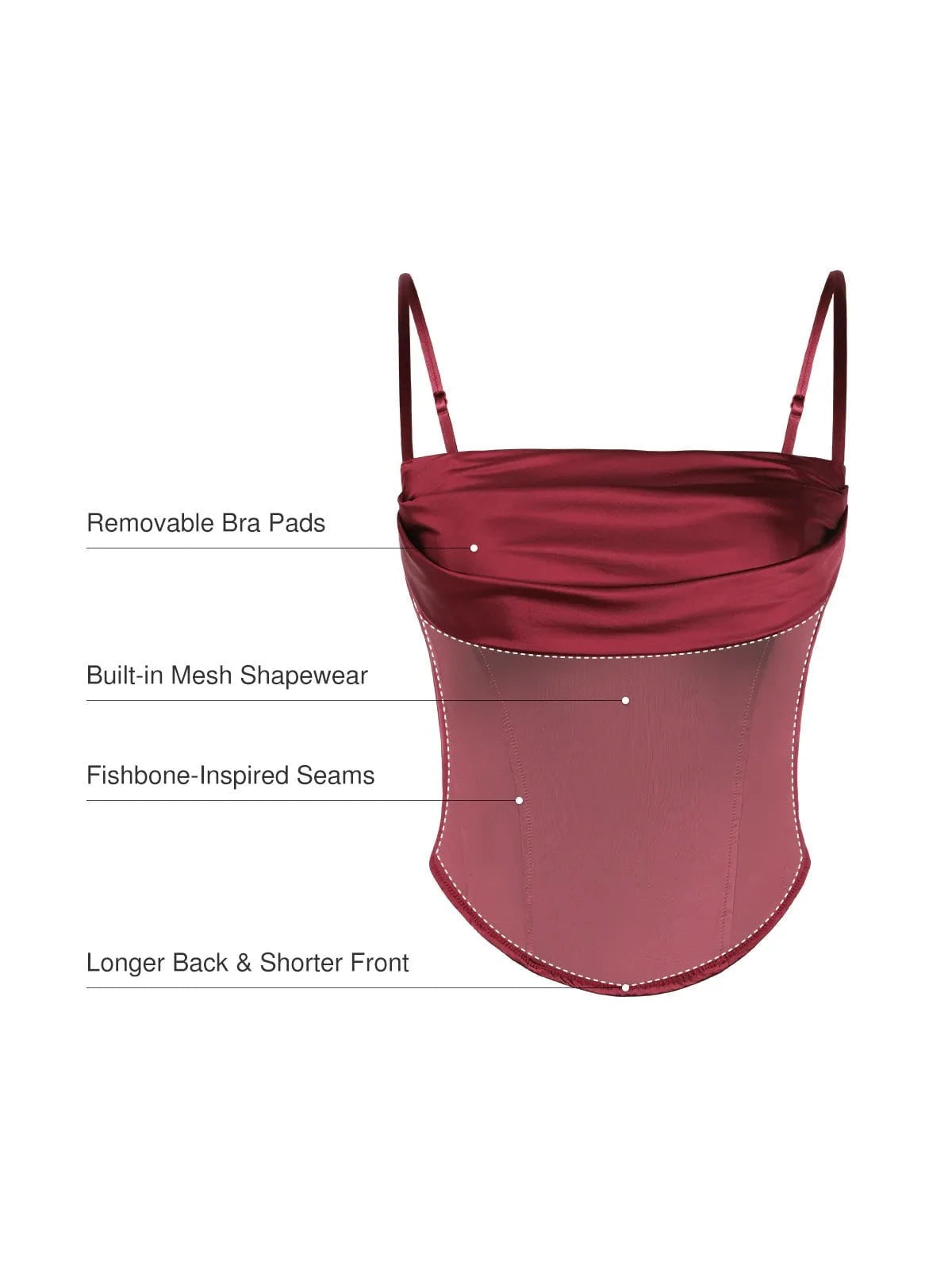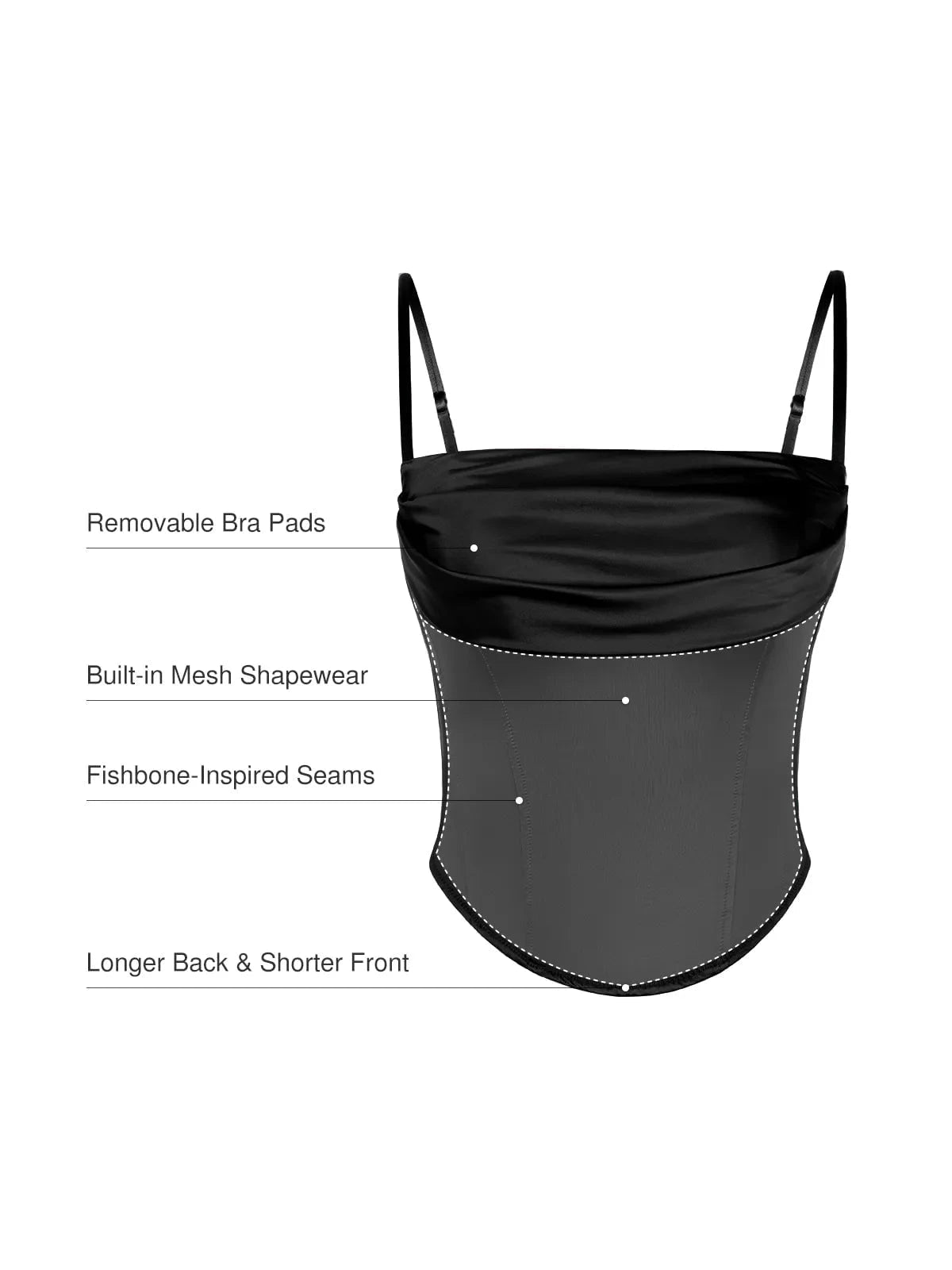 Built-in shaping mesh defines the waist, while underbust elastic and side panels support and shape the breasts. Removable pads allow for bra-free wear.
