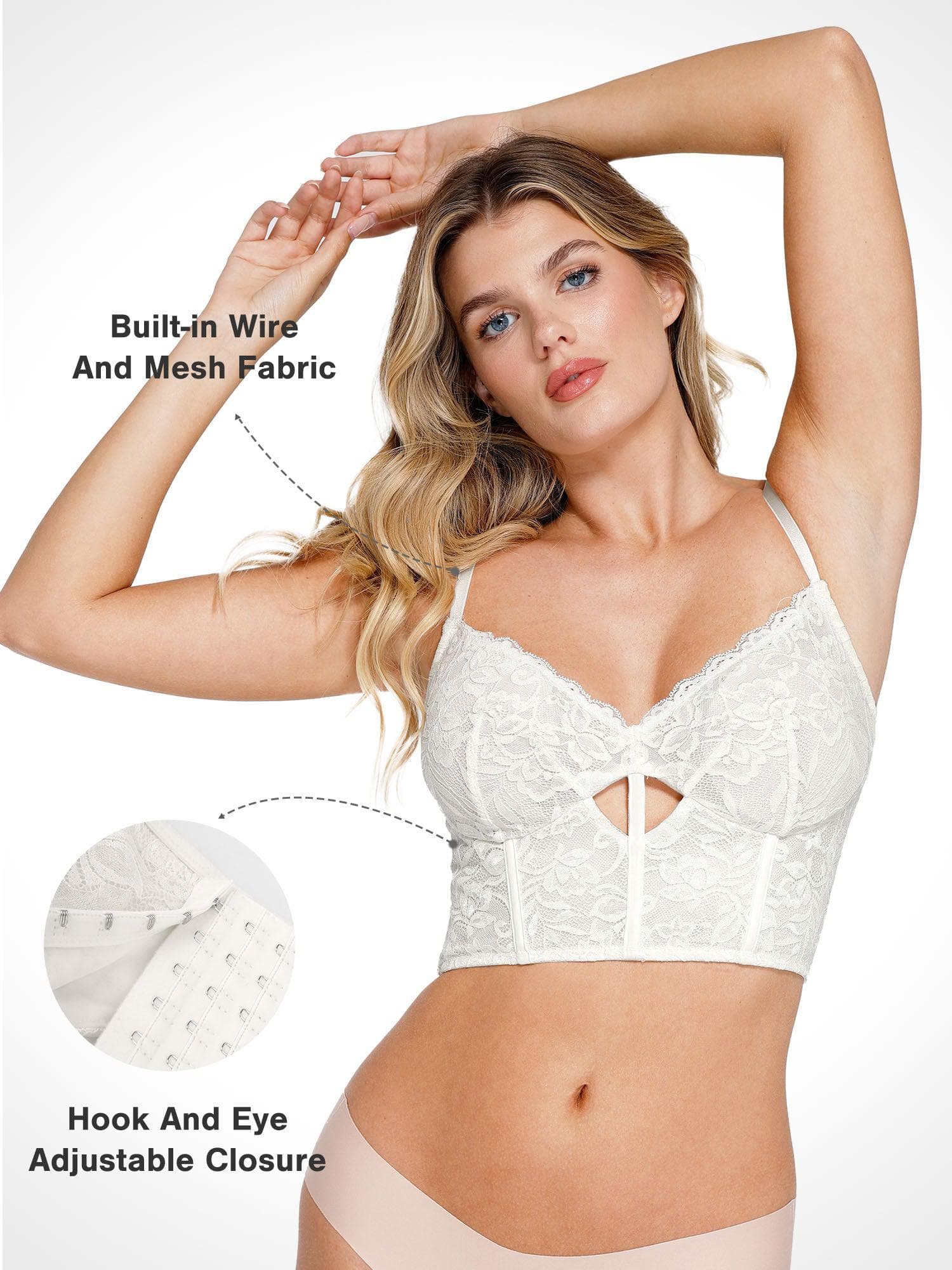 • Integrated Underwire: Shapes and supports fuller busts with a center cutout design, while elegant lace fabric adds a seductive appeal.
