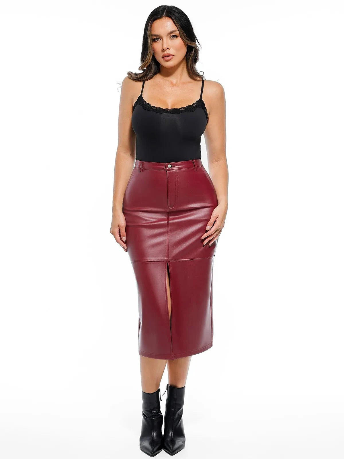 Pairs effortlessly with bodysuits, blouses, or tucked-in tops. The front slit ensures comfortable mobility while walking.